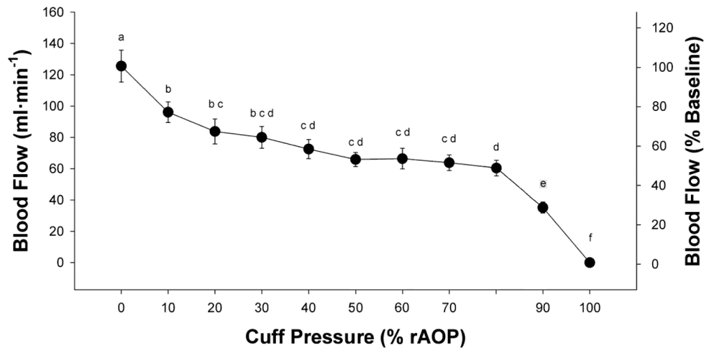 While increasing from 10 to 20% rAOP or 80-90% (rAOP) both significantly impacted blood flow, changing cuff pressure between 30 and 80% rAOP did not significantly impact SFA blood flow (30 vs. 80% rAOP: P=0.08; 40-70 vs. 80% rAOP: P=1.00). Thus, while blood flow may be trending towards a difference between 30% and 80% rAOP, the data convincingly illustrates that cuff pressures ranging from 40-80% rAOP elicit very similar blood flow responses at rest. rAOP = resting Arterial Occlusion PressureSource