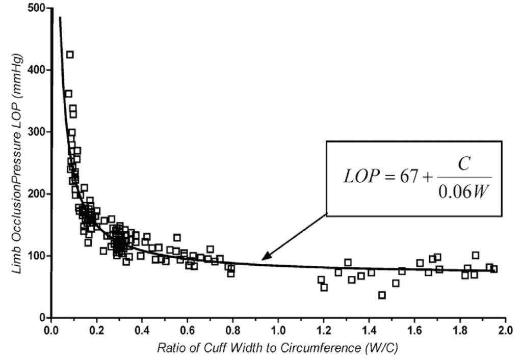 Limb occlusion pressure (LOP) versus the ratio of tourniquet cuff width to limb circumference. For any given limb circumference, the tourniquet pressure required to stop arterial blood flow decreases inversely as the width of the tourniquet cuff increases. Original source: Graham et al. (1990) Occlusion of arterial flow in the extremities at subsystolic pressures through the use of wide tourniquet cuffs