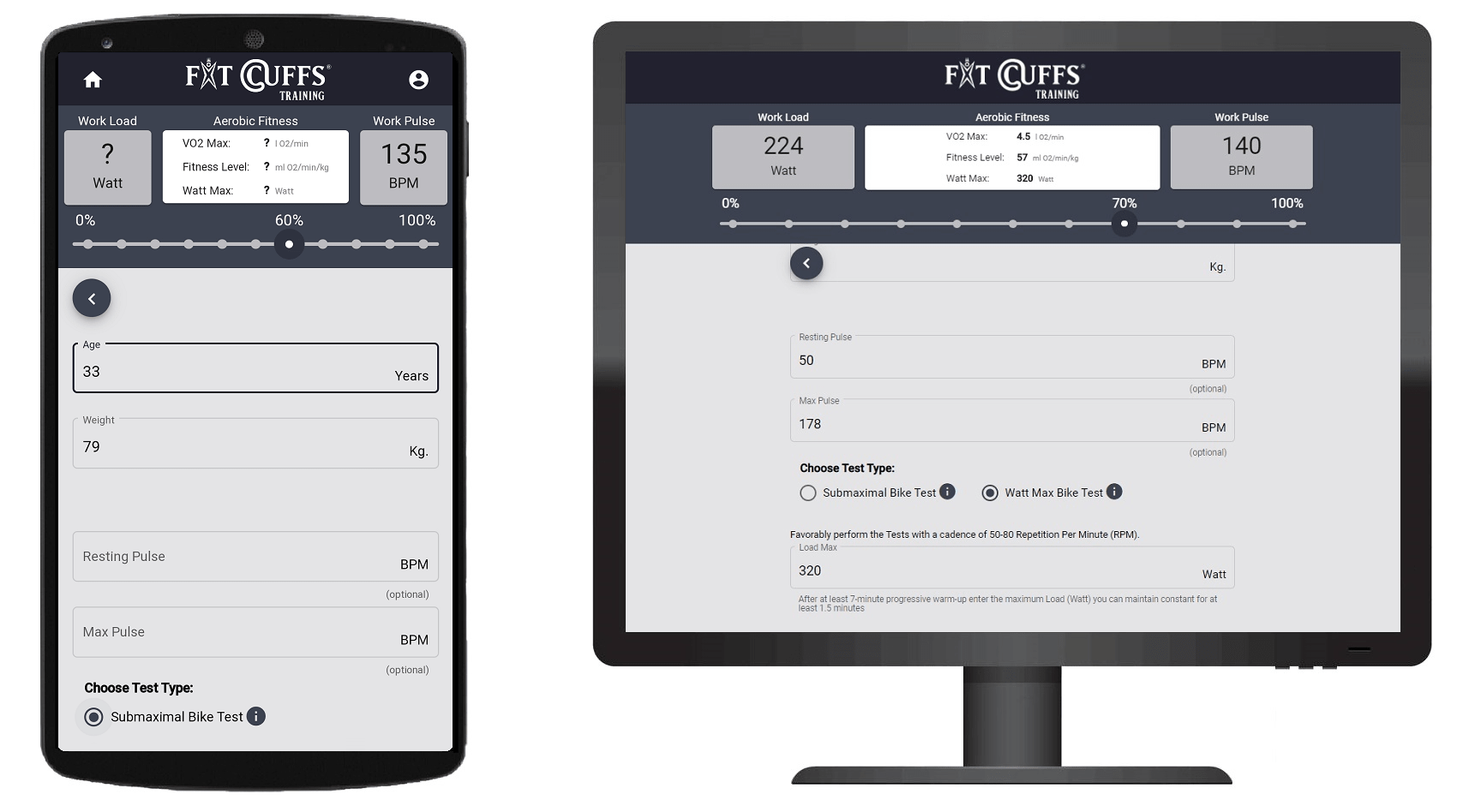 Submaximal and all-out Bike Tests to estimate VO2 max Fitness Level and Watt max, then use the slider to set the desired intensity. Relevant for BFR aerobic exercise