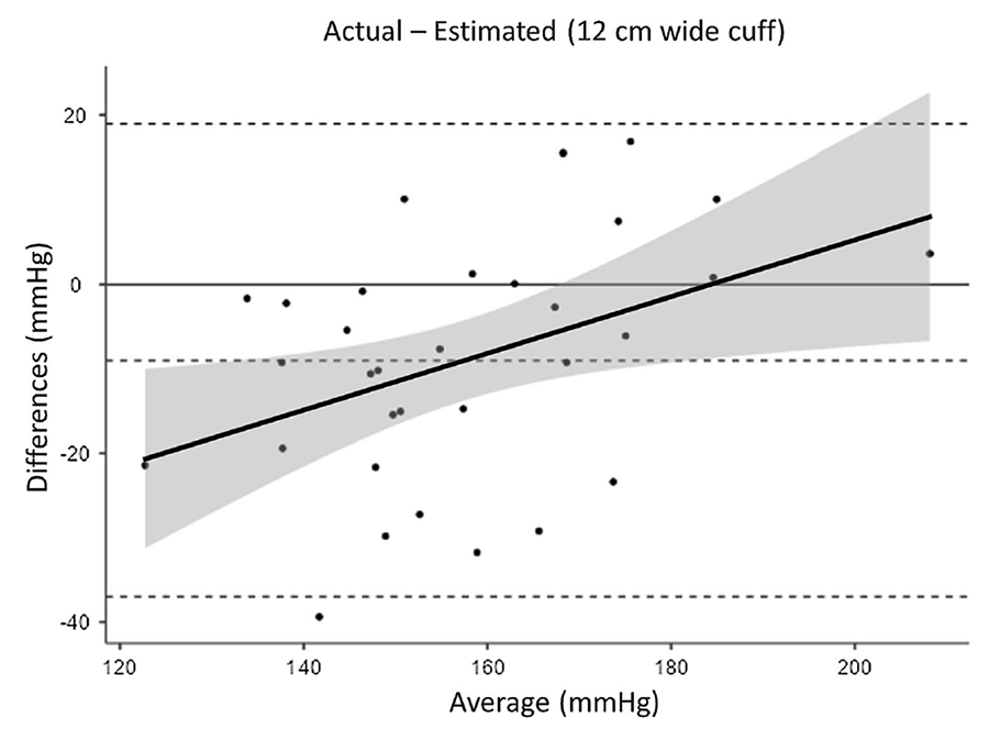 Bland Altman Plot of the actual arterial occlusion compared to the estimated arterial occlusion pressure (12 cm wide cuff). Differences between actual and estimated is on the y-axis. On the x-axis is the average of the two values. The proportional bias is noted by the solid black line and the 95% confidence interval is noted by the gray shadow around the line. The mean bias and the 95% limits of agreement are noted by the dotted lines. Individual values are noted by black dots.