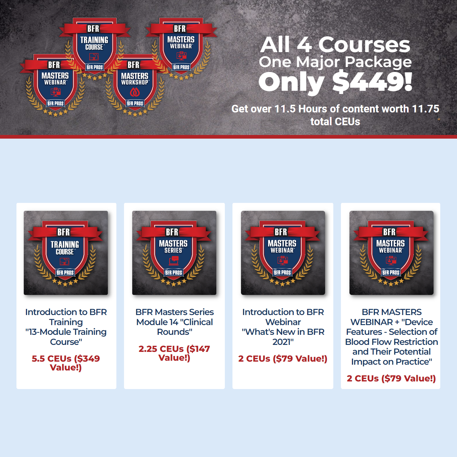 (Update 2024) Blood Flow Restriction – All 4 Courses One Major Package. +13 Module Online Video BFR Training Course by Dr. Nicholas Rolnick PT, MS, CSCS. Help more patients with BFR training & learn how to implement BFR Training safely and effectively with the 11.5 hour online BFR certification training course (11.75 total CEUs). Within 24-48 hours after purchase You will receive a link for the course.